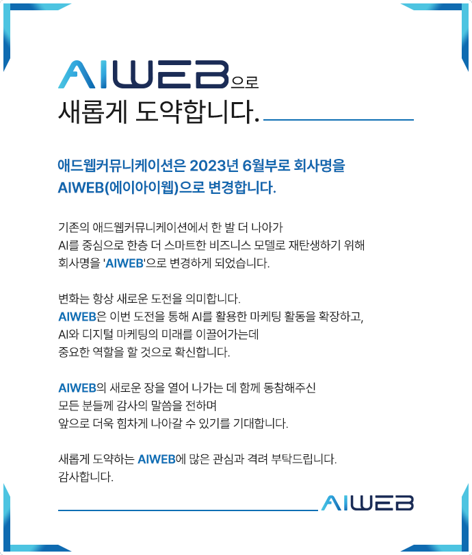 회사명을 'AIWEB(에이아이웹)'으로 변경하였습니다.