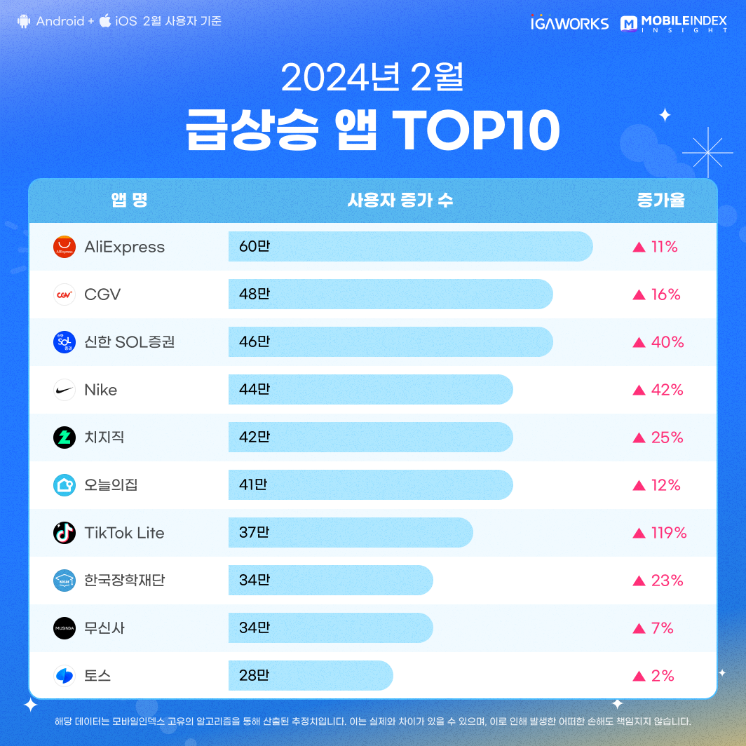 2위는 48만 명의 사용자가 증가한 CGV 앱입니다. 아무래도 2월에 '웡카', '파묘', '듄: 파트2' 등의 기대작이 연달아 개봉한 덕을 제대로 본 것이 아닐까 싶습니다. 그리고 이어서 급상승 앱 3위는 신한 SOL증권, 4위는 Nike, 5위는 치지직, 6위는 오늘의집, 7위는 TikTok Lite, 8위는 한국장학재단, 9위는 무신사, 10위는 토스로 확인되었습니다.