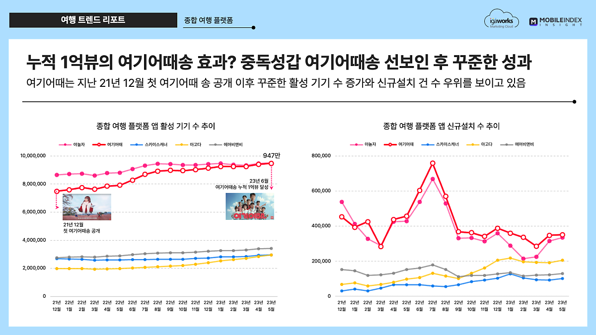 실제로 여기어때송 공개 이후 여기어때의 활성 기기 수는 꾸준히 증가해 23년 5월 947만 기기 수 를 달성했습니다.