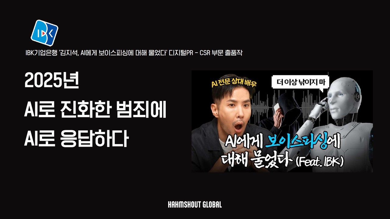 | 동상 | 함샤우트글로벌 | IBK기업은행 | IBK기업은행 'AI가 알려주는 보이스피싱 대처법'' | ||